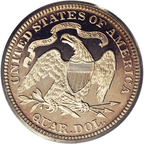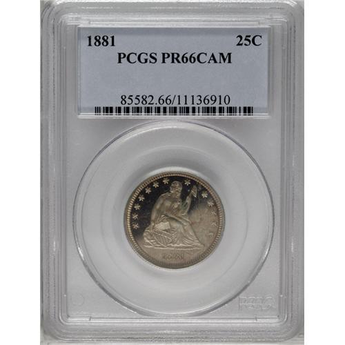 <B>1881<25C> PR66 Cameo PCGS.</B></I> Approximately 470 1881 proofs (out of a mintage of 975 pieces) have been certified by PCGS and NGC combined; fewer than 70 proofs carry the Cameo designation. Stunning contrast arises between crisply impressed, well frosted design elements and mirrored fields. A thin veneer of reddish-tan patina is slightly deeper on the obverse. What appears to be a nearly invisible vertical planchet striation was struck into the right obverse field, and a lint mark appears on Liberty's left (right facing) knee, and a couple of others are noted near the arm and knee. Population: 11 in 66, 6 finer (5/06).