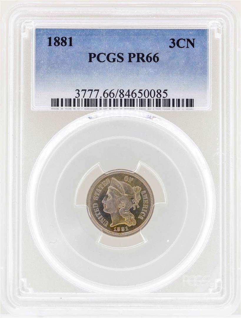 One 1881 3 Cent Nickel Proof Coin PCGS PR66- Great Color. PCGS Graded.