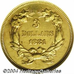 <table><tr><td><table><tr><td>1881 $3--Cleaned--ANACS. Unc Details, Net AU50. A glossy olive and honey-gold example with prooflike but hairlined fields. Struck from a boldly clashed reverse die. Business strikes and proofs combined for only 554 pieces, and survivors in all grades are under strong demand from the many collectors of this popular series. <BR><BR><B>Important notice:</B> Heritage usually auctions material at the rate of 200-250 lots per hour. On some occasions eBay Live bid software or the Internet may not be able to keep up with the pace of the auction. We recommend placing a realistic absentee bid now as insurance to avoid disappointment. Occasionally the auctioneer may eliminate or reject an eBay Live bid, and the auctioneer may also reopen a lot after the close of the eBay live bidding (usually because we missed an audience bid), and may reject your bid even if it shows you as the winning bidder. By bidding via eBay Live, you agree that Heritage may award the lot to another bidder at its sole discretion under the circumstances described above or any other reasonable circumstances. Since eBay bids are not shown to us until we open the lot on the floor, we treat those bids just like floor bids. In most cases the floor responds before the eBay bid is presented to us, due to Internet lag time, so for consistency we have made it a policy that floor bids are always considered first over tie eBay live bids. Also please note that all Heritage lots purchased through eBay Live carry a 20% Buyer's Premium. Please make sure you read the Terms and Conditions before you bid. <BR><BR><B>IMPORTANT ANNOUNCEMENT ABOUT RESERVES:</B> Heritage now divulges all reserves on its web site 7 days before every auction. If you want to know whether the reserve on this lot has been met, and if not, what the reserve amount is, please visit this lot page on the HeritageCoin.com web site, or email: bid@HeritageGalleries.com </span></font></td></tr></table></td></tr></table>