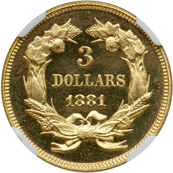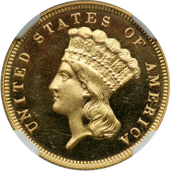 A glittering, brilliant proof with exquisite eye appeal including frosty motifs and deeply reflective fields that bring into being a significant cameo contrast. Vibrant surfaces come alive with the golden color. Remarkably attractive and an important three dollar proof gold issue. Pop 9; 3 finer in 66 (PCGS # 88045) .