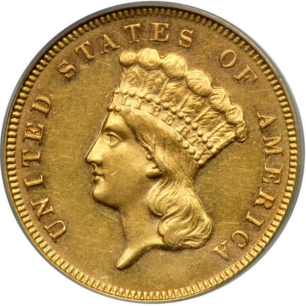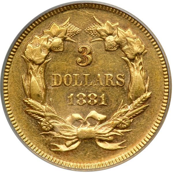 1881. PCGS graded AU-55 PQ CAC Approved. Nice even light gold tone. This date is famous among the later $3 issues for having a mintage well under the magical 1,000 pieces. In fact, the business strike figure is exactly half that number, 500, plus there were 54 Proofs sold to collectors. Needless to say, it might take months and months to find a comparable specimen, so why not take advantage of this occasion and bid? Pop 11 (PCGS # 8003) .