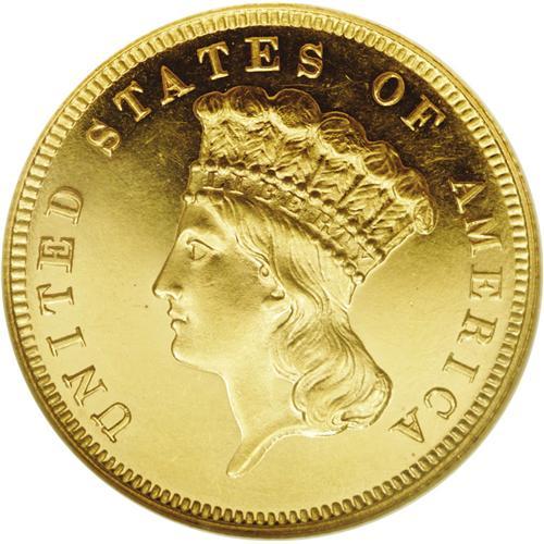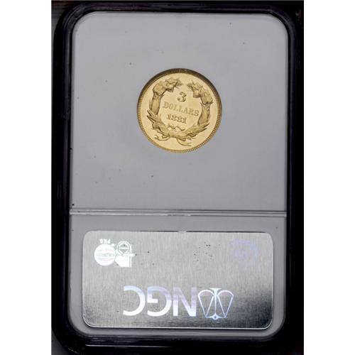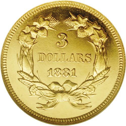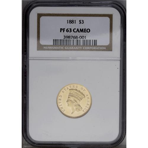 <B>1881<$3> PR63 Cameo NGC.</B></I> The three dollar denomination largely consists of low mintage issues. But even by the standards of the series, the production of the 1881 was exceptionally small. A mere 500 business strikes were coined, in addition to 54 proofs. The latter compares favorably, for example, with the 1888, which had a production of 291 proofs. Because the business strike mintage of the 1881 is minute, many Uncirculated survivors are prooflike, as they were struck from fresh dies. Proofs are readily distinguished from their commercial counterparts by the date location. The first 1 in the date is fully left of the first L in DOLLARS on the proofs, while business strikes feature the 1 in the date centered beneath the left edge of the L. The present boldly struck specimen exhibits radiant devices and has only unimportant hairlines throughout the flashy fields.<BR><I>From The Lake Highlands Collection.</B></I>