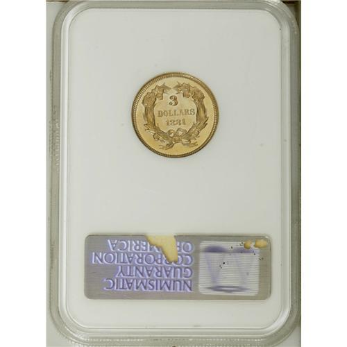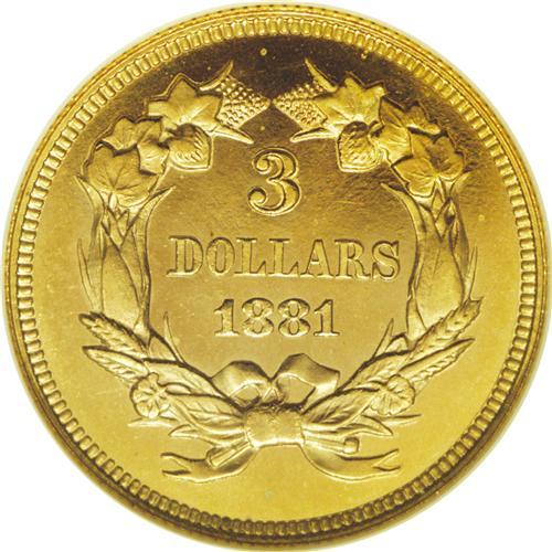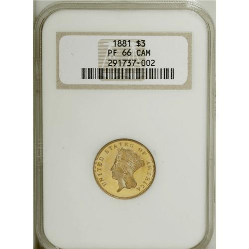 <B>1881 $3 PR66 Cameo NGC.</B></I> The 1881 three dollar gold issue boasts a limited mintage of 500 business strikes and 54 proofs. This beautiful Premium Gem offers needle-sharp design details and mildly reflective fields. A lovely cameo effect is evident on both obverse and reverse. The surfaces exhibit dominant orange-gold coloration intermingled with small amounts of ice-blue toning, mainly on the portrait. There are no bothersome contact marks, but some minor haziness is noted. Certainly one of the more important survivors of this low mintage issue. Census: 4 in 66 Cameo, 0 finer (11/06).<BR><BR><b>Shipping:</b> Coin/Currency (<a target="_blank" href="http://www.heritageauctions.com/common/shipping.php">view shipping information</a>)
