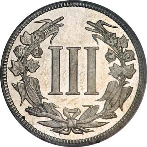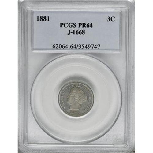 <B>1881 3C Liberty Head Three Cents, Judd-1668, Pollock-1869, High R.6, PR64 PCGS.</B></I> The design is reminiscent of the issued Charles Barber 1883 Liberty nickel, but there are no stars, and the obverse border instead displays UNITED STATES OF AMERICA. The reverse has no legends aside from the Roman numeral III. Struck in nickel with a plain edge. Medium golden-tan toning visits this sharply struck and undisturbed near-Gem. The reverse has a solitary carbon fleck at 7:30. Population: 2 in 64, 4 finer (11/07).<BR><I>From The Madison Collection.</B></I><BR><BR><b>Shipping:</b> Coins & Currency (<a target="_blank" href="http://www.heritageauctions.com/common/shipping.php">view shipping information</a>)