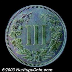 <table><tr><td><TABLE cellSpacing=0 cellPadding=0 width="100%" bgColor=#000000 border=0><TBODY> <TR><TD width="100%"><TABLE cellSpacing=1 cellPadding=3 width="100%" border=0><TBODY><TR><TD width="100%" bgColor=#79735c><FONT face=arial color=#ffffff size=3><B>Description</B> </FONT></TD></TR><TR><TD width="100%" bgColor=#ffffff><FONT face=arial size=2><B>1881 3C Liberty Head Three Cents, Judd-1669, Pollock-1870, R.7, PR64 Red and Brown PCGS.</B></I> A Three-Cent Nickel pattern featuring the head on the obverse similar to that used on the adopted five-cent piece of 1883. UNITED STATES OF AMERICA surrounds the head with the date below. The reverse has a Roman numeral III in the center, surrounded by a wreath of cotton and corn. Struck in copper with a plain edge. Deeply toned overall in shades of jade-green and brick-red. A few tiny toning spots are seen on the obverse, perhaps the most noticeable being above Liberty's head in the field near the F of OF. </FONT></TD></TR></TBODY></TABLE></TD></TR></TBODY></TABLE><BR><A name=PricesRealized></A><TABLE cellSpacing=0 cellPadding=0 width="100%" bgColor=#000000 border=0><TBODY><TR><TD width="100%"><TABLE cellSpacing=1 cellPadding=3 width="100%" border=0><TBODY><TR><TD width="100%" bgColor=#79735c><A name=PR><FONT face=arial color=#ffffff size=3><B>Previous Prices from Heritage Auctions</B> </FONT></A></TD></TR><TR><TD bgColor=#f6f6ed>No Prior Data Recorded </TD></TR><TR><TD bgColor=#ffffff><FONT face=arial size=1 ?>PLEASE NOTE: All prices realized reflect the final hammer price PLUS the buyer's premium in auctions that charge a buyer's premium. Each item has a notation at the top of the listing indicating whether that lot included a buyer's premium. Example: A item that sells with a final hammer price of $100 and a 20% buyer's premium will display with a price realized of $120. All information listed is intended to be as accurate as possible, but errors are possible. Please use this guide carefully and inform us of any inaccuracies. </FONT></TD></TR></TBODY></TABLE></TD></TR></TBODY></TABLE><BR><TABLE cellSpacing=0 cellPadding=0 width="100%" bgColor=#000000 border=0><TBODY><TR><TD width="100%"><TABLE cellSpacing=1 cellPadding=3 width="100%" border=0><TBODY><TR><TD width="100%" bgColor=#79735c colSpan=6><FONT face=arial color=#ffffff size=3><B>Price Guide*</B> </FONT></TD></TR><TR bgColor=#f6f6ed><TD align=middle><B>Grade</B> </TD><TD align=middle><B>Coin World<BR>(Trends)</B> </TD><TD align=middle><B>Numismedia<BR>Retail</B> </TD><TD align=middle><B>Numismedia<BR>Wholesale</B> </TD><TD align=middle><B>Coin<BR>Universe</B> </TD><TD align=middle><B>Heritage<BR>Value Index</B> </TD></TR><TR bgColor=#ffffff><TD align=middle>63</TD><TD align=right>---</TD><TD align=right>---</TD><TD align=right>---</TD><TD align=right>---</TD><TD align=right>---</TD></TR><TR style="FONT-WEIGHT: bold" bgColor=#cccfdd><TD align=middle>64</TD><TD align=right>---</TD><TD align=right>---</TD><TD align=right>---</TD><TD align=right>---</TD><TD align=right>---</TD></TR><TR bgColor=#ffffff><TD align=middle>65</TD><TD align=right>---</TD><TD align=right>---</TD><TD align=right>---</TD><TD align=right>---</TD><TD align=right>---</TD></TR><TR bgColor=#ffffff><TD colSpan=6><FONT size=1>*All information listed is intended to be as accurate as possible, but errors are possible. No item may be returned or refused based on this information which is provided as a service to our customers. You should contact each pricing source directly to determine the accuracy of this information. </FONT></TD></TR></TBODY></TABLE></TD></TR></TBODY></TABLE><BR><TABLE cellSpacing=0 cellPadding=0 width="100%" bgColor=#000000 border=0><TBODY><TR><TD width="100%"><TABLE cellSpacing=1 cellPadding=3 width="100%" border=0><TBODY><TR><TD width="100%" bgColor=#79735c><FONT face=arial color=#ffffff size=3><B>Population Guide</B> </FONT></TD></TR><TR bgColor=#ffffff><TD align=middle><!-- Begin Output of Population Grid--><TABLE cellSpacing=0 cellPadding=0 width="100%" border=0><TBODY><TR><TD vAlign=center><TABLE cellSpacing=0 width="100%" border=1 cellsadding="3"><TBODY><TR><TD vAlign=center><TABLE cellSpacing=0 cellPadding=3 width="100%" border=1><TBODY><TR><TD vAlign=center align=middle bgColor=#f0f1e8 colSpan=2 <CENTER><FONT face=Arial size=2><B>PCGS Pop </B></FONT><CENTER></CENTER></TD><TD vAlign=center align=middle bgColor=#f0f1e8 colSpan=2><CENTER><FONT face=Arial size=2><B>NGC Pop</B></CENTER></FONT></TD></TR><TR><TD vAlign=center><FONT face=Arial size=2>(64)</FONT> </TD><TD vAlign=center align=right><FONT face=Arial size=2>9</FONT> </TD><TD vAlign=center><FONT face=Arial size=2>(64)</FONT> </TD><TD vAlign=center align=right><FONT face=Arial size=2>0</FONT> </TD></TR><TR><TD vAlign=center><FONT face=Arial size=2>(>64)</FONT> </TD><TD vAlign=center align=right><FONT face=Arial size=2>0</FONT> </TD><TD vAlign=center><FONT face=Arial size=2>(>64)</FONT> </TD><TD vAlign=center align=right><FONT face=Arial size=2>1</FONT> </TD></TR></TBODY></TABLE></TD></TR></TBODY></TABLE></TD></TR></TBODY></TABLE><!-- End Output of Population Grid--></TD></TR></TBODY></TABLE></TD></TR></TBODY></TABLE><BR><TABLE cellSpacing=0 cellPadding=0 width="100%" bgColor=#000000 border=0><TBODY><TR> Important notice: Heritage usually auctions material at the rate of 200-250 lots per hour. On some occasions eBay Live bid software or the Internet may not be able to keep up with the pace of the auction. We recommend placing a realistic absentee bid now as insurance to avoid disappointment. Occasionally the auctioneer may eliminate or reject an eBay Live bid, and the auctioneer may also reopen a lot after the close of the eBay live bidding (usually because we missed an audience bid), and may reject your bid even if it shows you as the winning bidder. By bidding via eBay Live, you agree that Heritage may award the lot to another bidder at its sole discretion under the circumstances described above or any other reasonable circumstances. Also 