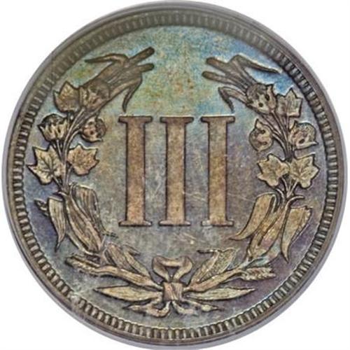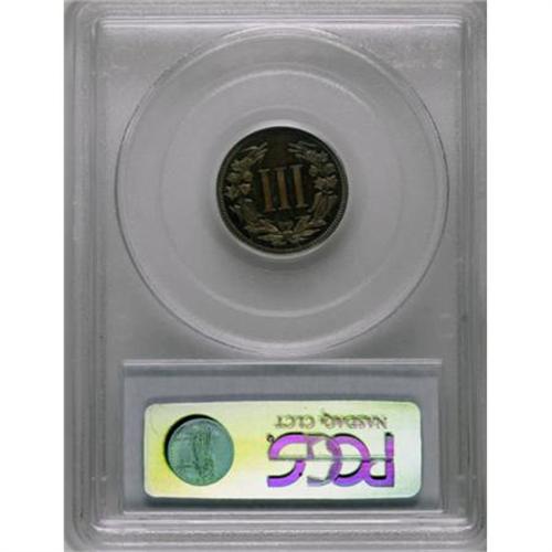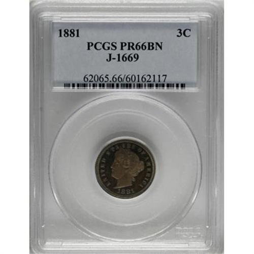 <B>1881 3C Liberty Head Three Cents, Judd-1669, Pollock-1870, High R.6, PR66 Brown PCGS.</B></I> Three cent nickel pattern featuring the head on the obverse similar to that used on the adopted Liberty nickel of 1883. The reverse has a Roman numeral III in the center, surrounded by a wreath of cotton and corn. Struck in copper with a plain edge. About a dozen pieces are known of this pattern in copper, this being the finest certified to date (7/07). This attractive specimen is deeply mirrored and tinged in steel-blue and apricot patina. It is identifiable by a lintmark in the center of Liberty's cheek.<BR><BR><BR><b>Shipping:</b> Coins & Currency (<a target="_blank" href="http://www.heritageauctions.com/common/shipping.php">view shipping information</a>)