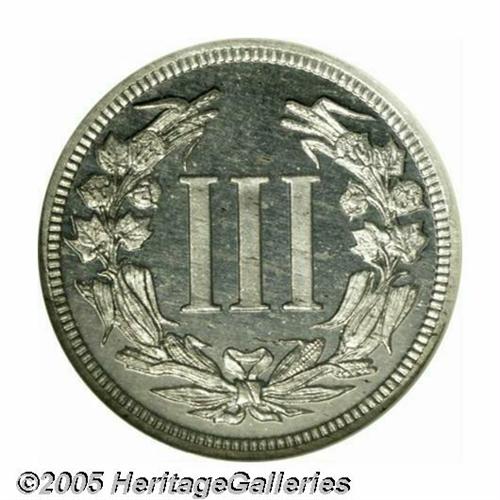 <B>1881<3C> Liberty Head Three Cents, Judd-1670, Pollock-1871, Low R.7, PR66 NGC.</B></I> A Three Cent Nickel pattern featuring the head on the obverse similar to that used on the adopted five cent piece of 1883. The reverse has a Roman numeral III in the center, surrounded by a wreath of cotton and corn. Struck in aluminum with a plain edge. This lovely Gem specimen displays excellent contrast overall and a touch of streakiness in the planchet on the reverse.<BR><I>From The Western Hills Collection.</B></I>