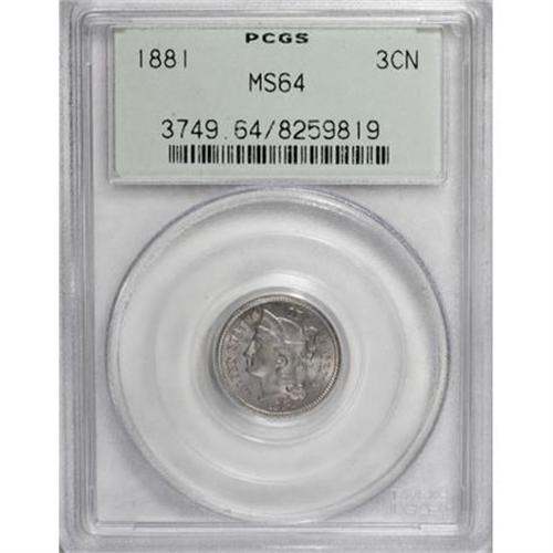<B>1881 3CN MS64 PCGS.</B></I> . PCGS Population (137/112). NGC Census: (152/59). Mintage: 1,080,575. Numismedia Wsl. Price for NGC/PCGS coin in MS64: $200. (#3749)<BR><BR><B>Coin Engraver:</B> James B. Longacre<BR><BR><b>Shipping:</b> Coins & Currency (<a target="_blank" href="http://www.heritageauctions.com/common/shipping.php">view shipping information</a>)