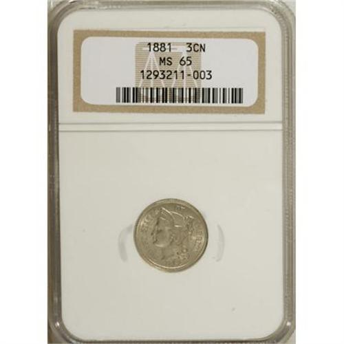 <B>1881 3CN MS65 NGC.</B></I> NGC Census: (49/11). PCGS Population (61/48). Mintage: 1,080,575. Numismedia Wsl. Price for NGC/PCGS coin in MS65: $560. (#3749)<BR><BR><B>Coin Engraver:</B> James B. Longacre<BR><BR><b>Shipping:</b> Coins & Currency (<a target="_blank" href="http://www.heritageauctions.com/common/shipping.php">view shipping information</a>\)