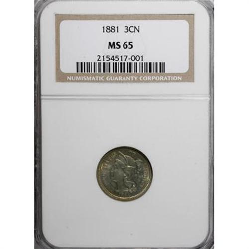 <B>1881 3CN MS65 NGC.</B></I> NGC Census: (49/10). PCGS Population (64/50). Mintage: 1,080,575. Numismedia Wsl. Price for NGC/PCGS coin in MS65: $575. (#3749)<BR><BR><B>Coin Engraver:</B> James B. Longacre<BR><BR><b>Shipping:</b> Coins & Currency (<a target="_blank" href="http://www.heritageauctions.com/common/shipping.php">view shipping information</a>)