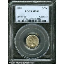 <B>1881 3CN MS66 PCGS.</B></I> Rarer in upper Mint State than in proof, this lovely specimen has a superb strike and is attractively toned in blue, gold, and rose shades. As one would expect from the condition, there are no mentionable flaws or distractions. Population: 46 in 66, 7 finer (1/05). Lot:5711