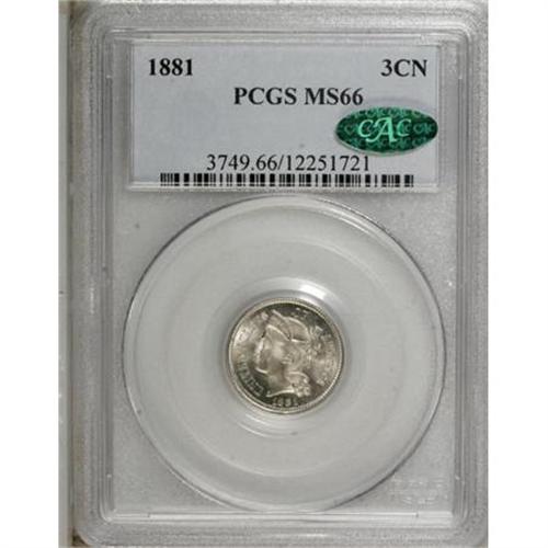 <B>1881 3CN MS66 PCGS. CAC.</B></I> Vibrant luster adorns the lightly toned surfaces of this Premium Gem. Exquisitely struck and impeccably preserved. A small planchet flaw is visible in the upper reverse. Population: 42 in 66, 7 finer (12/07).<BR><BR><B>Coin Engraver:</B> James B. Longacre<BR><BR><b>Shipping:</b> Coins & Currency (<a target="_blank" href="http://www.heritageauctions.com/common/shipping.php">view shipping information</a>)