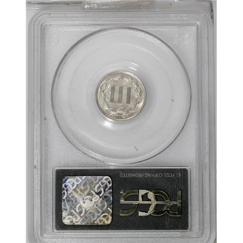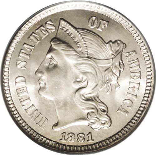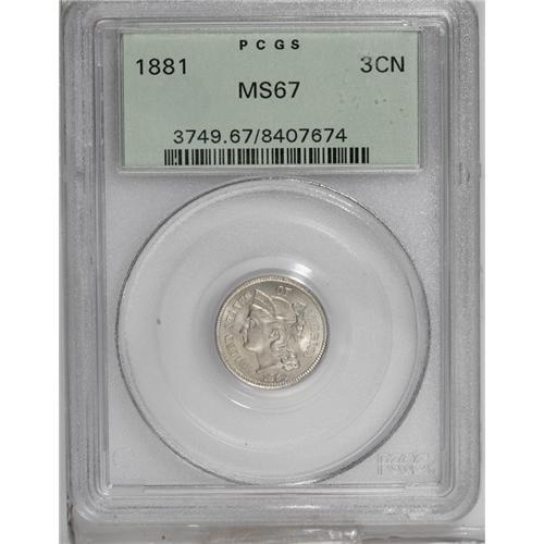 <B>1881<3CN> MS67 PCGS.</B></I> A decision was made in 1881 to dramatically increase the production of three cent nickels, but despite a mintage of over one million pieces, relatively few Gems survive and Superb pieces are almost never seen. This delicately tinted example displays luxuriant luster and excellent highpoint definition. Antique-gold hues are lightly displayed on each side. Housed in an early PCGS holder with a green insert. This is one of the finest specimens thus far certified by either service. Population at PCGS and NGC combined: nine in 67, none are finer (6/06).