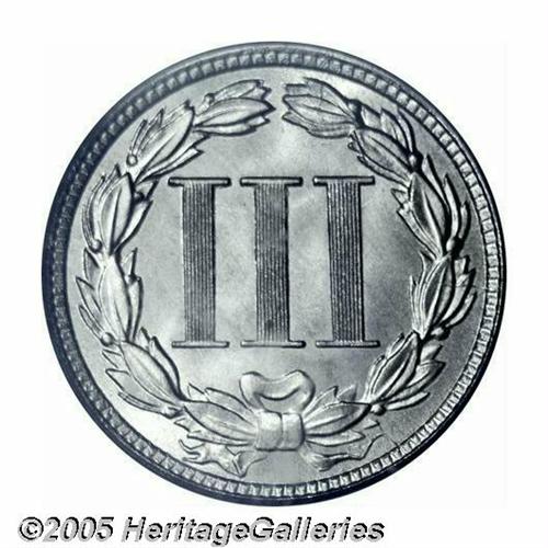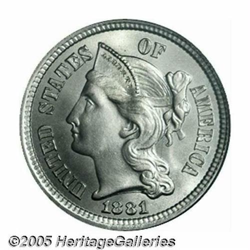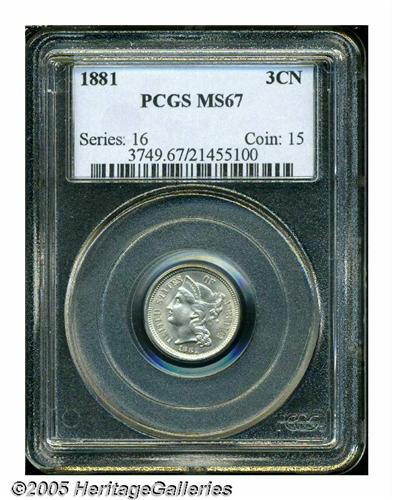 <B>1881<3CN> MS67 PCGS.</B></I> An instantly appealing Gem with impeccable, creamy surfaces that are free from toning or unsightly carbon. The strike is needle sharp in all areas and the only interruption to the pristine fabric of the coin is horizontal die crack at 3 o'clock on the reverse. Population: 7 in 67, 0 finer (4/05).<BR><I>From The Western Hills Collection.</B></I>