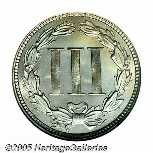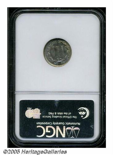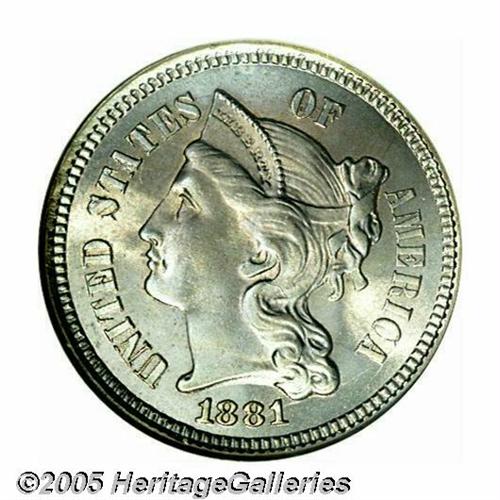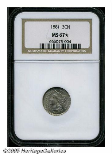 <B>1881<3CN> MS67 <S NGC.</B></I> A decision was made in 1881 to dramatically increase the production of Three Cent Nickels, but despite a mintage of over one million pieces, relatively few Gems survive and Superb pieces are almost never seen. This delicately tinted example displays luxuriant luster and excellent highpoint definition. Ice-blue, rose, and antique-gold hues are included on each side. This is the single finest specimen thus far certified by NGC, PCGS has only seen seven, with none finer at either service (4/05).