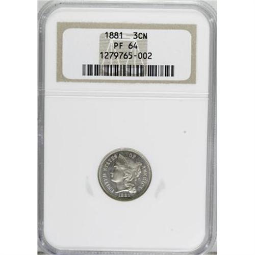 <B>1881 3CN PR64 NGC.</B></I> NGC Census: (146/532). PCGS Population (262/600). Mintage: 3,575. Numismedia Wsl. Price for NGC/PCGS coin in PR64: $304. (#3777)<BR><BR><b>Shipping:</b> Coins & Currency (<a target="_blank" href="http://www.heritageauctions.com/common/shipping.php">view shipping information</a>)