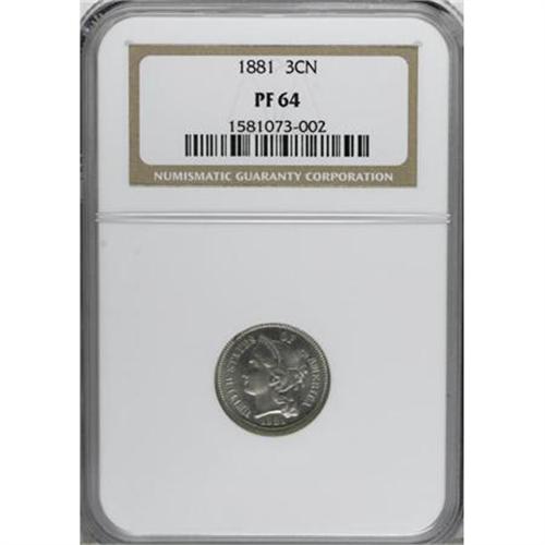 <B>1881 3CN PR64 NGC.</B></I> NGC Census: (147/531). PCGS Population (264/609). Mintage: 3,575. Numismedia Wsl. Price for NGC/PCGS coin in PR64: $320. (#3777)<BR><BR><B>Coin Engraver:</B> James B. Longacre<BR><BR><b>Shipping:</b> Coins & Currency (<a target="_blank" href="http://www.heritageauctions.com/common/shipping.php">view shipping information</a>)
