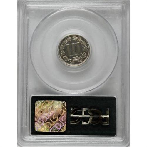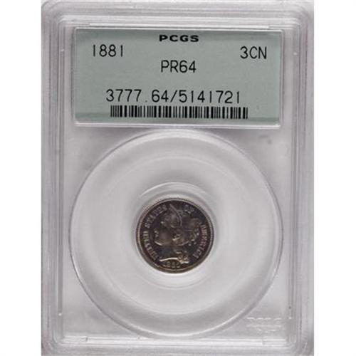<B>1881 3CN PR64 PCGS.</B></I> PCGS Population (264/610). NGC Census: (147/531). Mintage: 3,575. Numismedia Wsl. Price for NGC/PCGS coin in PR64: $320. (#3777)<BR><BR><B>Coin Engraver:</B> James B. Longacre<BR><BR><b>Shipping:</b> Coins & Currency (<a target="_blank" href="http://www.heritageauctions.com/common/shipping.php">view shipping information</a>)