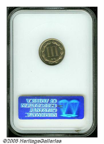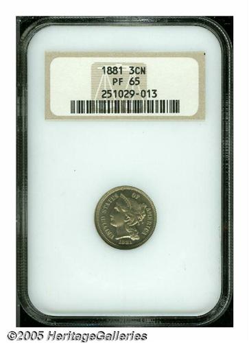 <B>1881<3CN> PR65 NGC.</B></I> Golden-yellow toning evenly covers the surfaces of this nicely lustrous Gem. Some scattered minute dark toning spots are seen, but these are barely noticeable. The left sides of the denominational pillars lack full definition.
