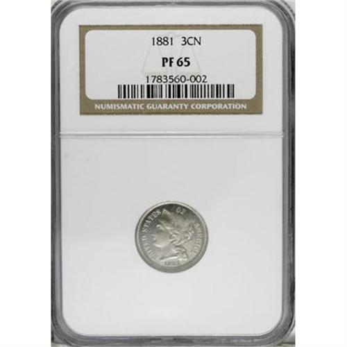 <B>1881 3CN PR65 NGC.</B></I> NGC Census: (265/269). PCGS Population (309/303). Mintage: 3,575. Numismedia Wsl. Price for NGC/PCGS coin in PR65: $540. (#3777)<BR><BR><B>Coin Engraver:</B> James B. Longacre<BR><BR><b>Shipping:</b> Coins & Currency (<a target="_blank" href="http://www.heritageauctions.com/common/shipping.php">view shipping information</a>)