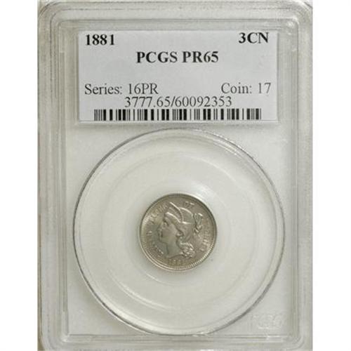 <B>1881 3CN PR65 PCGS.</B></I> PCGS Population (303/297). NGC Census: (263/269). Mintage: 3,575. Numismedia Wsl. Price for NGC/PCGS coin in PR65: $525. (#3777)<BR><BR><b>Shipping:</b> Coins & Currency (<a target="_blank" href="http://www.heritageauctions.com/common/shipping.php">view shipping information</a>)