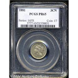 <B>1881<3CN> PR65 PCGS.</B></I> Well struck with lovely olive-rose color, smooth unblemished surfaces, and a small planchet flaw (as struck) on Liberty's upper jaw, just below the ear. <BR><BR><B>Important notice:</B> Heritage usually auctions material at the rate of 200-250 lots per hour. On some occasions eBay Live bid software or the Internet may not be able to keep up with the pace of the auction. We recommend placing a realistic absentee bid now as insurance to avoid disappointment. Occasionally the auctioneer may eliminate or reject an eBay Live bid, and the auctioneer may also reopen a lot after the close of the eBay live bidding (usually because we missed an audience bid), and may reject your bid even if it shows you as the winning bidder. By bidding via eBay Live, you agree that Heritage may award the lot to another bidder at its sole discretion under the circumstances described above or any other reasonable circumstances. Since eBay bids are not shown to us until we open the lot on the floor, we treat those bids just like floor bids. In most cases the floor responds before the eBay bid is presented to us, due to Internet lag time, so for consistency we have made it a policy that floor bids are always considered first over tie eBay live bids. Also please note that all Heritage lots purchased through eBay Live carry a 20% Buyer's Premium. Please make sure you read the Terms and Conditions before you bid.