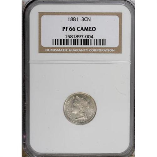 <B>1881 3CN PR66 Cameo NGC.</B></I> An untoned and highly attractive proof striking. Excellent contrast is seen on each side and there are no mentionable marks on this high grade piece.<BR><BR><b>Shipping:</b> Coins & Currency (<a target="_blank" href="http://www.heritageauctions.com/common/shipping.php">view shipping information</a>)