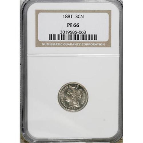 <B>1881 3CN PR66 NGC.</B></I> . NGC Census: (222/53). PCGS Population (241/62). Mintage: 3,575. Numismedia Wsl. Price for NGC/PCGS coin in PR66: $725. (#3777)<BR><BR><B>Coin Engraver:</B> James B. Longacre<BR><BR><b>Shipping:</b> Coins & Currency (<a target="_blank" href="http://www.heritageauctions.com/common/shipping.php">view shipping information</a>)