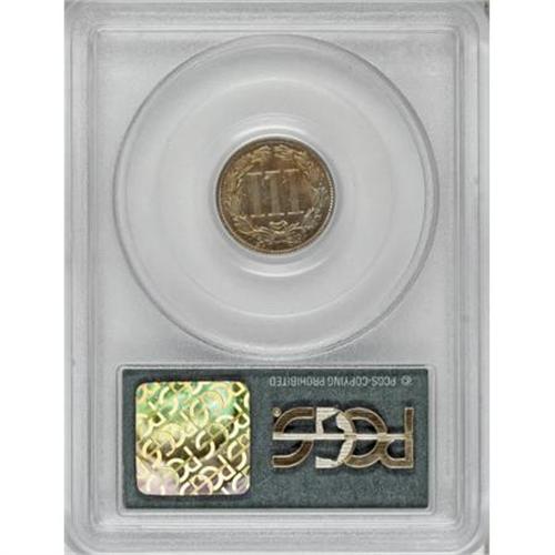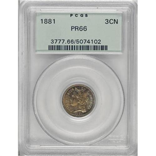 <B>1881 3CN PR66 PCGS.</B></I> Elegant orange and blue-green patina graces this Premium Gem. A crisply struck and strongly mirrored specimen, carefully preserved and immensely appealing for this issue of 3,575 pieces.<BR><I>From The Good Humor Collection.</B></I><BR><BR><B>Coin Engraver:</B> James B. Longacre<BR><BR><b>Shipping:</b> Coins & Currency (<a target="_blank" href="http://www.heritageauctions.com/common/shipping.php">view shipping information</a>)
