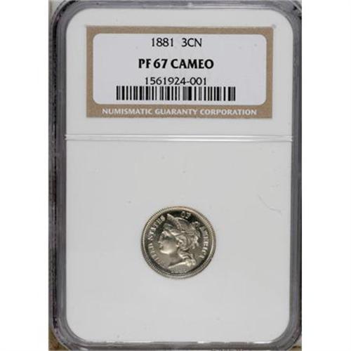 <B>1881 3CN PR67 Cameo NGC.</B></I> Deeply reflective, essentially untoned fields and boldly impressed devices converge on this carefully preserved later three cent nickel proof. Appealing with distinct contrast. Census: 26 in 67 Cameo, 7 finer (5/07).<BR><BR><b>Shipping:</b> Coins & Currency (<a target="_blank" href="http://www.heritageauctions.com/common/shipping.php">view shipping information</a>)