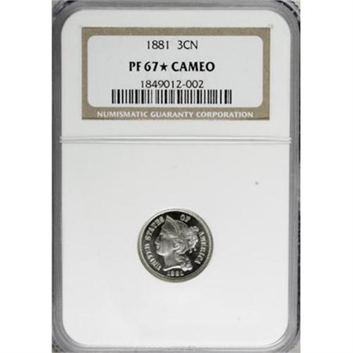 <B>1881 3CN PR67 </B></I> S<B> Cameo NGC.</B></I> This dazzling Superb Gem proof exhibits stark field-to-device contrast on each side, between the richly frosted devices and the jet-black fields. Fully struck and impeccably preserved. NGC Census: 3 in 67 <img border='0' src='http://www.heritagecoins.com/images/star.gif' width=10 height=10> Cameo, 2 in 68 <img border='0' src='http://www.heritagecoins.com/images/star.gif' width=10 height=10> Cameo, none finer (6/07). <BR><BR><b>Shipping:</b> Coins & Currency (<a target="_blank" href="http://www.heritageauctions.com/common/shipping.php">view shipping information</a>)