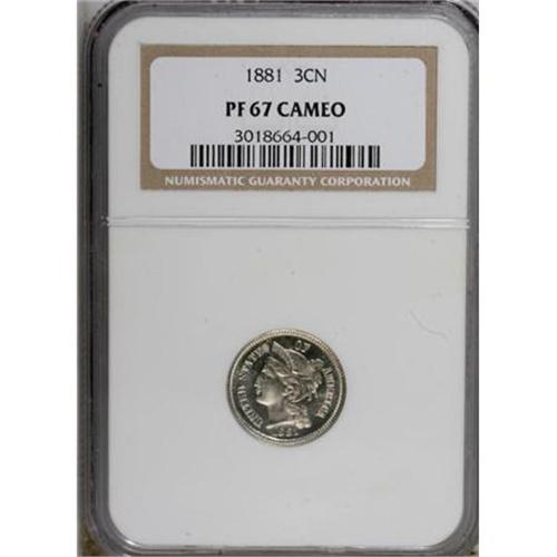 <B>1881 3CN PR67 Cameo NGC.</B></I> The 1881 three cent nickel proofs are among the most available pieces from the final decade of issue, though populations remain small and demand high for Superb Gems. This carefully preserved and gleaming nickel-gray Superb Gem shows significant contrast on both sides. Census: 30 in 67 Cameo, 7 finer (8/07).<BR><BR><b>Shipping:</b> Coins & Currency (<a target="_blank" href="http://www.heritageauctions.com/common/shipping.php">view shipping information</a>)