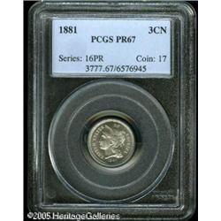 <B>1881 3CN PR67 PCGS.</B></I> A Superb Gem Proof with excellent eye appeal. Light cameo contrast is visible despite the satiny nature of the fields. Lightly reflective but not deeply mirrored. The blue-gray surfaces have wisps of lilac toning.<BR><I>From The Mike Jacobson Collection.</B></I> Lot:5754