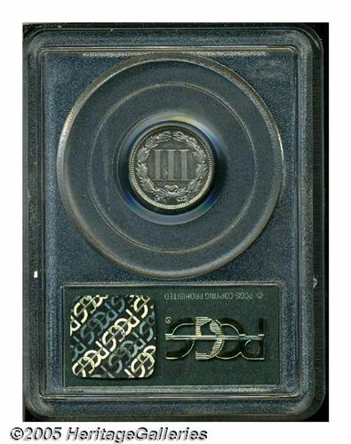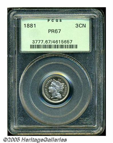 <B>1881<3CN> PR67 PCGS.</B></I> The 8s in the date are each recut within their loops. An outstanding proof three cent nickel that would be the perfect type coin. The surfaces are brilliant and the fields deeply mirrored, with not even the smallest handling mark apparent on either side. A tiny planchet flaw (as struck) rests beside the N in UNITED, on the lower obverse, and there is some scattered milky patina over the reverse, but these elements are easy to overlook.