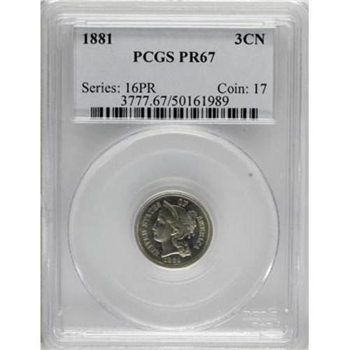 <B>1881 3CN PR67 PCGS.</B></I> PCGS Population (59/4). NGC Census: (45/7). Mintage: 3,575. Numismedia Wsl. Price for NGC/PCGS coin in PR67: $1,100. (#3777)<BR><BR><B>Coin Engraver:</B> James B. Longacre<BR><BR><b>Shipping:</b> Coins & Currency (<a target="_blank" href="http://www.heritageauctions.com/common/shipping.php">view shipping information</a>\)