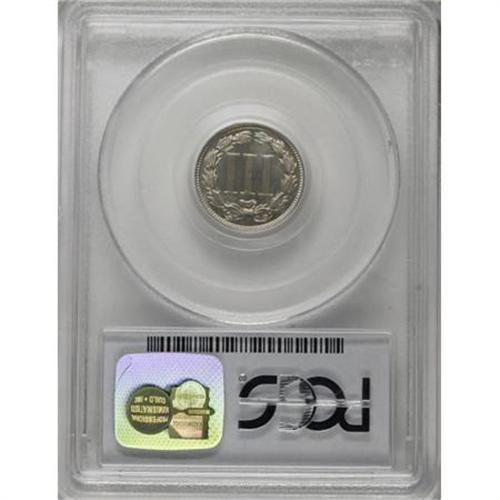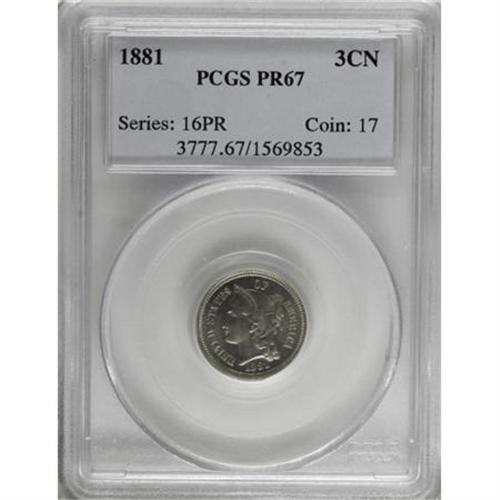 <B>1881 3CN PR67 PCGS.</B></I> This year's proof issue of 3,575 pieces complemented the last business-strike issue of over a million coins. This luminous Superb Gem shows lovely champagne patina overall with hints of lavender. PCGS has graded just four finer non-Cameo proofs (8/07).<BR><I>From The Mario Eller Collection, Part One.</B></I><BR><BR><B>Coin Engraver:</B> James B. Longacre<BR><BR><b>Shipping:</b> Coins & Currency (<a target="_blank" href="http://www.heritageauctions.com/common/shipping.php">view shipping information</a>)