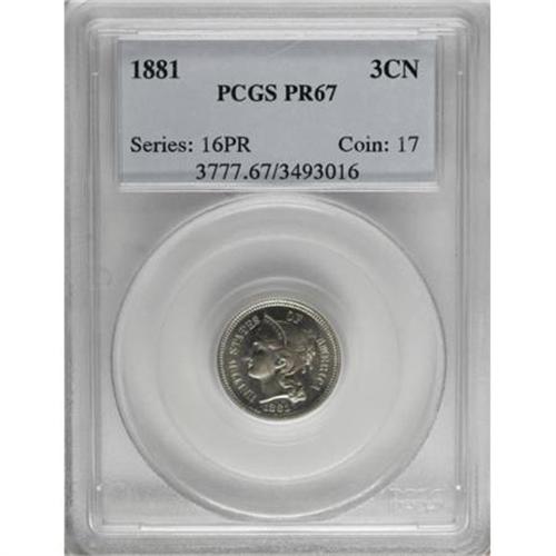 <B>1881 3CN PR67 PCGS.</B></I> This enticing Superb Gem is one of the best-preserved representatives from an issue of 3,575 proofs. The gleaming fields show only a hint of patina on the reverse. PCGS has graded only four finer specimens (8/07).<BR><BR><B>Coin Engraver:</B> James B. Longacre<BR><BR><b>Shipping:</b> Coins & Currency (<a target="_blank" href="http://www.heritageauctions.com/common/shipping.php">view shipping information</a>)