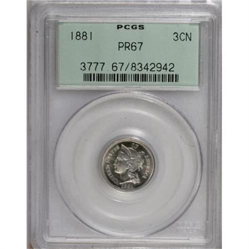 <B>1881 3CN PR67 PCGS.</B></I> A beautiful proof three cent nickel with fully brilliant surfaces that display intense reflectivity in the fields and substantial frost on the devices. Exquisitely preserved and housed in an earlier green label holder. PCGS has graded only three coins finer (10/07).<BR><BR><B>Coin Engraver:</B> James B. Longacre<BR><BR><b>Shipping:</b> Coins & Currency (<a target="_blank" href="http://www.heritageauctions.com/common/shipping.php">view shipping information</a>)