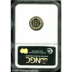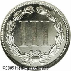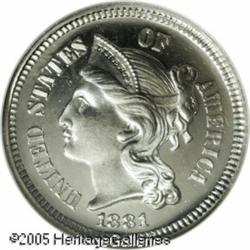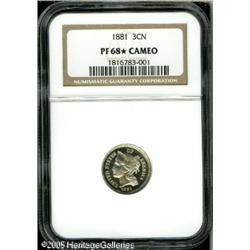 <B>1881 3CN PR68 <img border='0' src='http://www.heritagecoins.com/images/star.gif' width=10 height=10> Cameo NGC.</B></I> Prior to 1878, mintages of minor Proof coinage was not specifically known. Beginning in that year, the Mint kept more accurate records of the production of these coins. Thus, the recorded figure of 3,575 coins for the Proof 1881 Three Cent Nickel coinage is considered to be accurate. This figure tops the silver Proof production by 2,600 coins.<BR> This remarkable Proof has fully brilliant surfaces with excellent contrast. Both sides are completely untoned with bright nickel-gray color. It also qualifies as tied for the finest proof example certified by NGC for the date, and for the type. NGC has certified two examples of this date as PR68 Cameo and two others as PR68 <img border='0' src='http://www.heritagecoins.com/images/star.gif' width=10 height=10> Cameo. Population: 4 in 68, 0 finer (1/05). Lot:5816