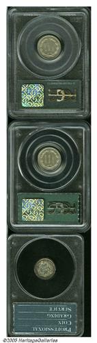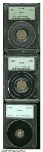 <B>1881<3CN> Three Cent Nickel PR65 PCGS,</B></I> pastel olive, gold, and rose colors, a small spot on the wreath bow; <B>1888 Three Cent Nickel PR64 PCGS,</B></I> boldly struck, blended dove-gray, aqua, and lilac toning; and an <B>1869 Half Dime PR64 PCGS,</B></I> golden-brown peripheral toning, undesignated cameo contrast, not fully struck on the top of the wreath, low proof mintage. All three pieces are in old green label holders.