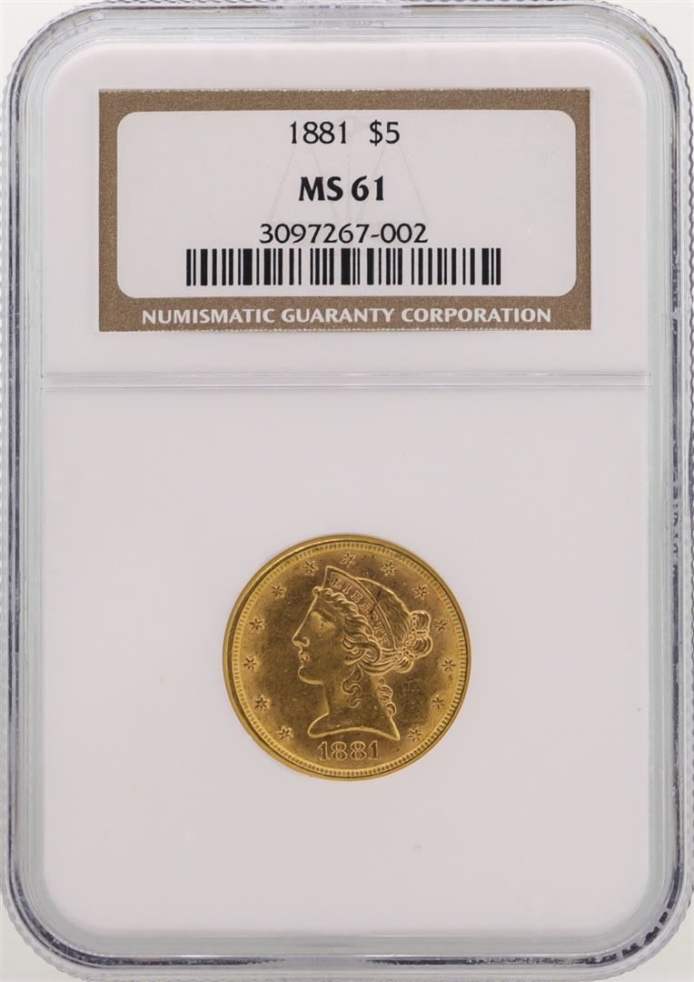 One 1881 $5 Liberty Head Half Eagle Gold Coin NGC MS61. NGC Certified.