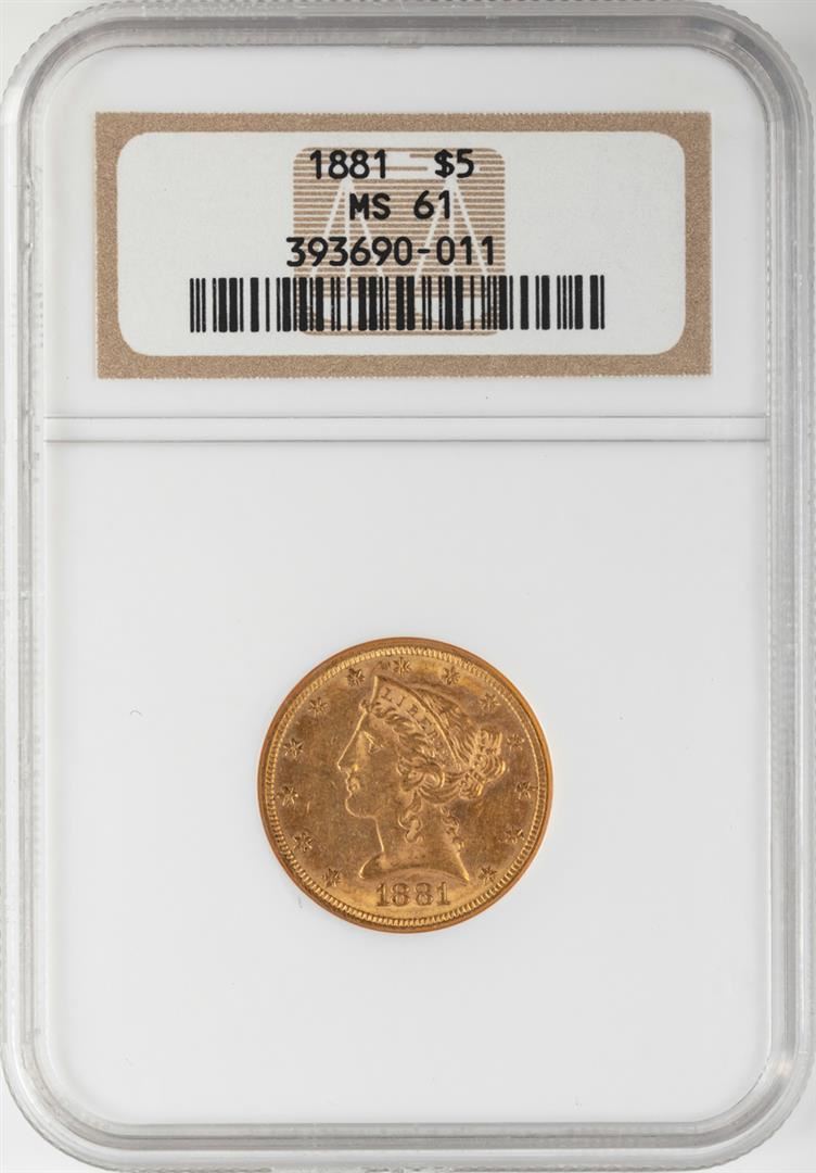 One 1881 $5 Liberty Head Half Eagle Gold Coin NGC MS61. NGC Certified.