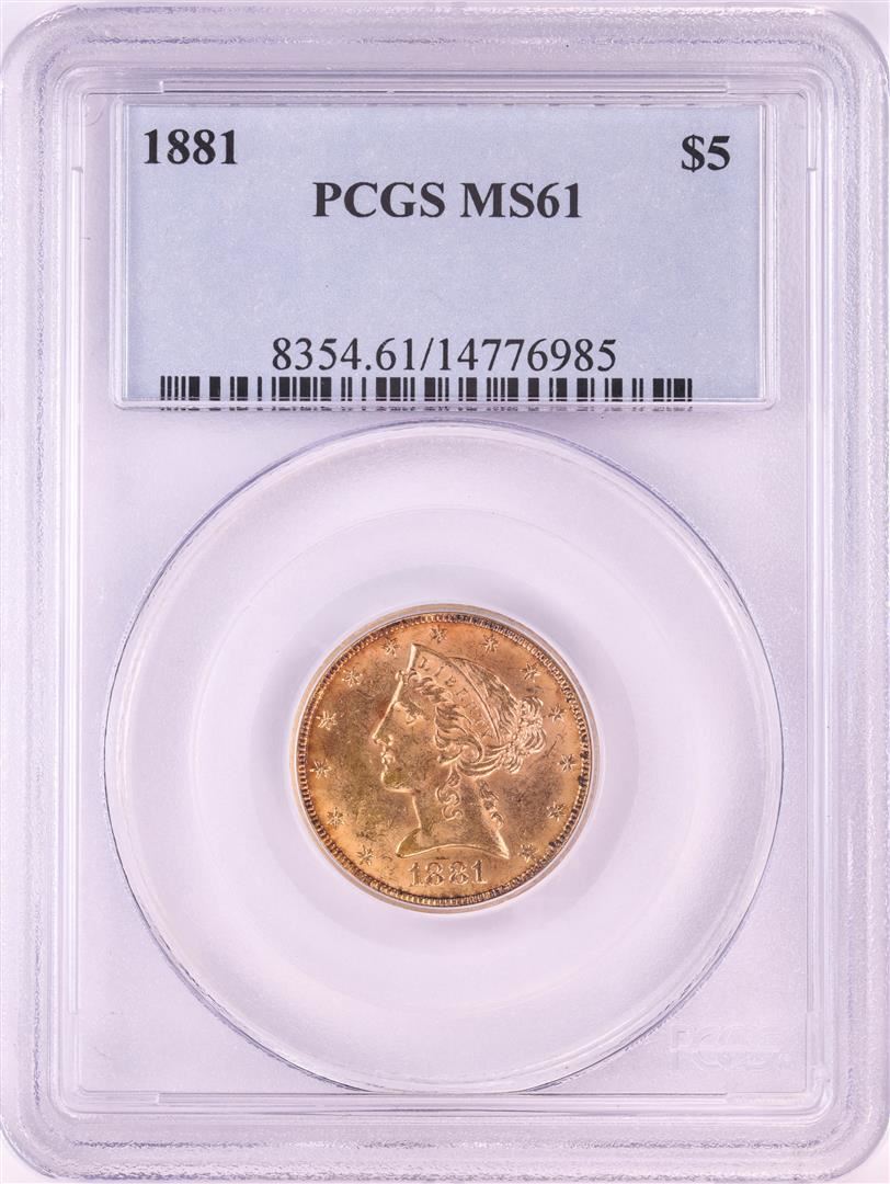 One 1881 $5 Liberty Head Half Eagle Gold Coin PCGS MS61. PCGS Graded.