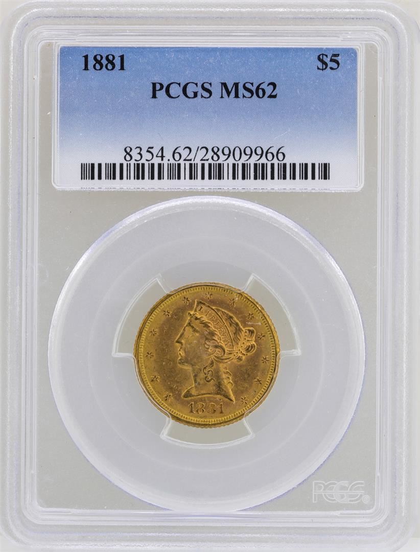 One 1881 $5 Liberty Head Half Eagle Gold Coin PCGS MS62. PCGS Graded.