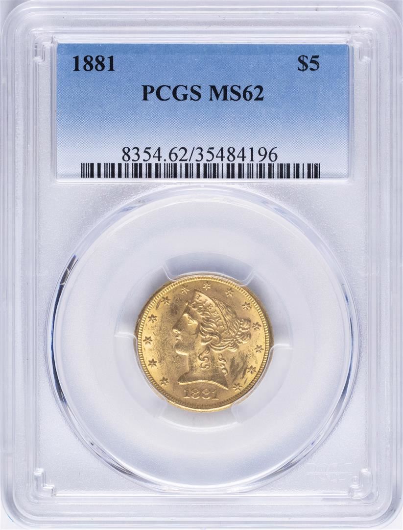 One 1881 $5 Liberty Head Half Eagle Gold Coin PCGS MS62. PCGS Graded.