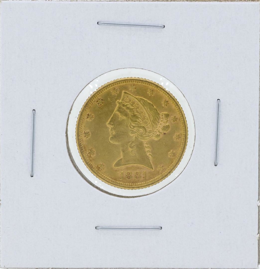 One 1881 $5 Liberty Head Half Eagle Gold Coin.
