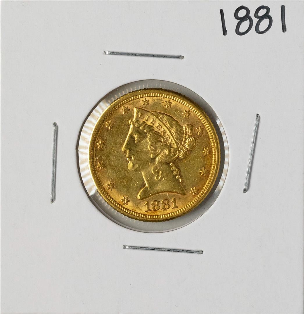 One 1881 $5 Liberty Head Half Eagle Gold Coin.