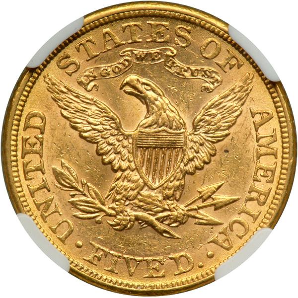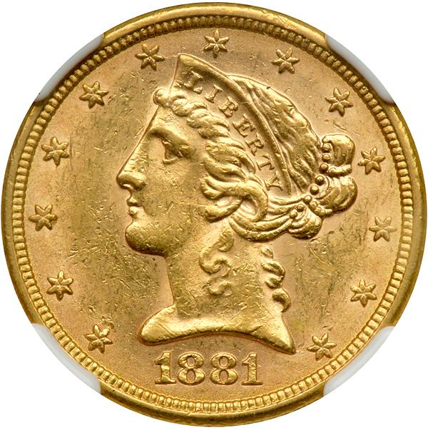 1881 $5 Liberty. NGC graded AU-58. Choice surfaces (PCGS # 8354) .