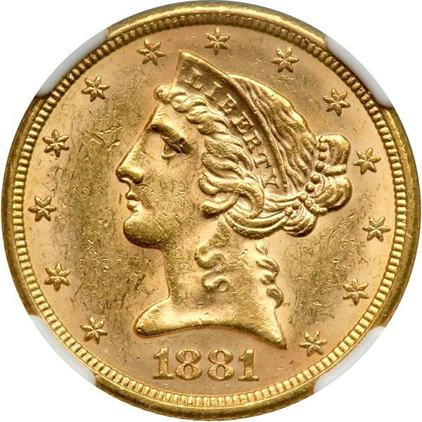 1881 $5 Liberty. NGC graded MS-62. Frosty and well struck (PCGS # 8354) .