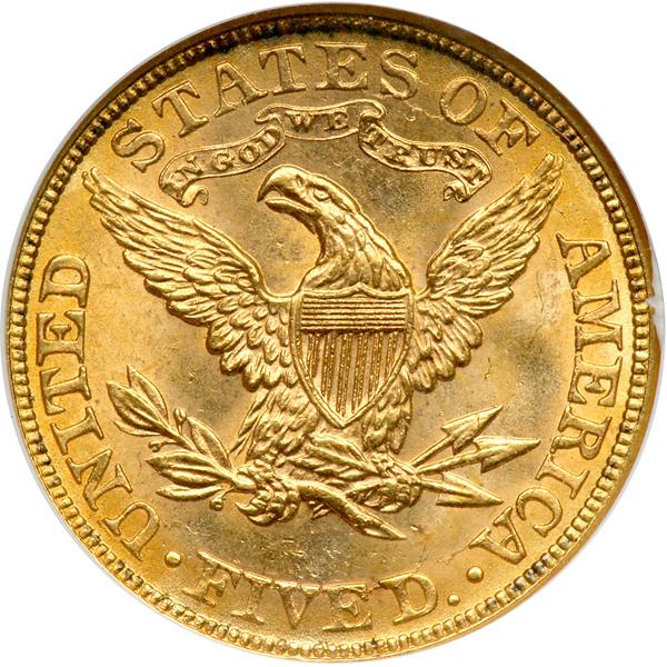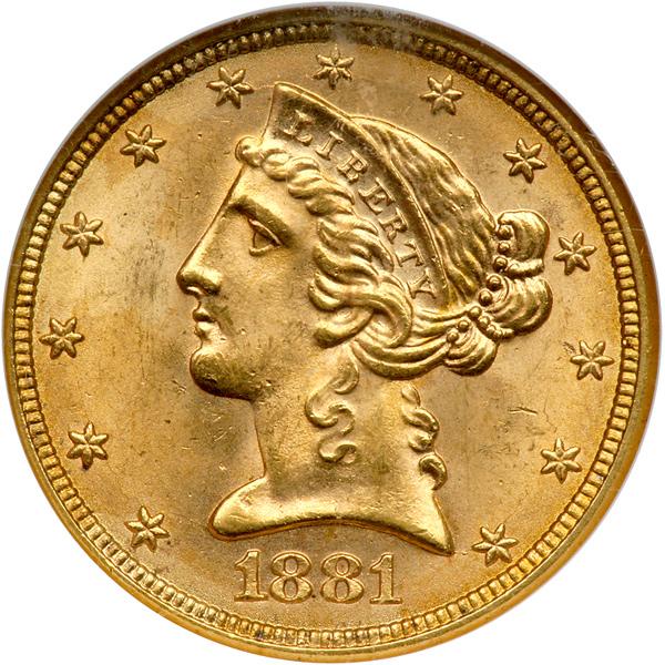 1881 $5 Liberty. NGC graded MS-65. It is not all that common to find a Gem Half Eagle struck in the 1880s, but the lucky bidder will instantly recognize this as a rich orange-gold coin that is leaps and bounds ahead of a more normal specimen. The strike is strong, too, with clear definition to the high points (PCGS # 8354) .